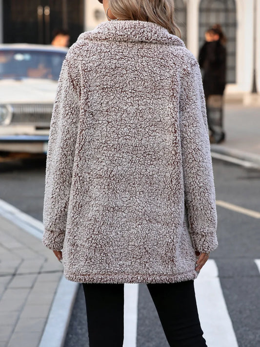 Pocketed Collared Neck Long Sleeve Plush Jacket